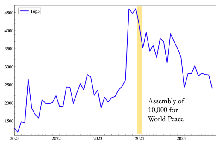 The assembly may have succeeded in its first goal, according to new peer-reviewed published research. During the two weeks of the assembly, there were sharp, statistically significant drops in political violence across some of the world’s most conflicted nations — confirming a prediction the researchers had publicly announced in advance.
